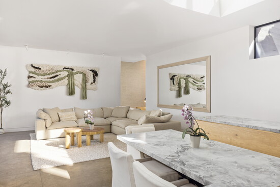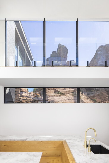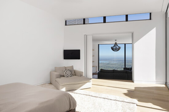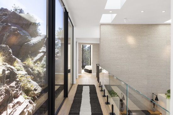 For seven years after purchasing the land, Bloom and the team at Adam Oklesh Architecture battled red tape and the realities of building on a ridge to create what he now describes as a sanctuary. He says they did hundreds of floorplan revisions, used controlled dynamite explosions for an entire month, and even carried the oversized triple-pane windows, custom-made in Poland, through the house because they couldn’t use a full-sized crane.