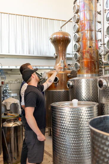“We’re giving people the opportunity to enjoy a hard beverage without it having to kick them in the teeth in order to do so…the secret to that actually is not so much in what we cut our spirits with, it’s actually what we filter or choose to not filter out,” says Justin. “Distillation is not just what you put in but what you keep in that will result in the final product. So our move to do huckleberry rum was two-fold; one, to do something that nobody else does and also because we’re staying true to form. We want a product that, should you be interested, you can drink it by itself. It doesn’t have to be mixed.”