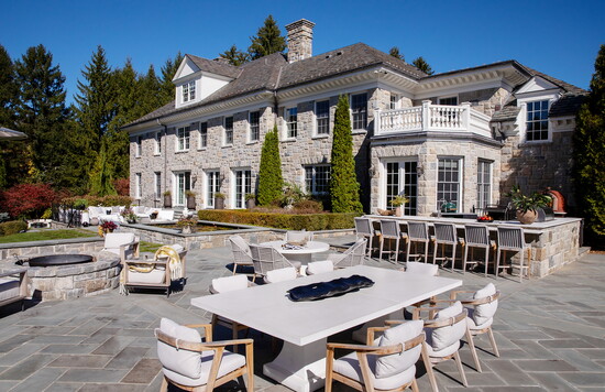 Anchored by the home’s striking stone facade, the outdoor space was designed for both relaxation and celebration across multiple zones. The bluestone patio serves as the central hub, flowing from dining and lounging to play. A sleek concrete dining table with teak chairs converts into a regulation-size ping-pong table, while a relaxed-height, custom 26-inch round table paired with lounge-height chairs offers an intimate family dining option. The outdoor kitchen and bar provide seating for six, and a nearby stone firepit—with teak armchairs and a hidden firewood nook—creates yet another cozy gathering spot.