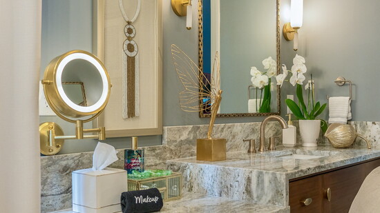 Instead of custom built vanities, lovely stained mid-century cabinets were sourced through ... legs, simple door/drawer panels and classic brass oval knobs created the setting. The waterfall lighted make up vanity was the solution for a small make up space with no custom build, it is creative on a countertop with unique, stylish and most importantly…functionality. A wonderful marble that works like granite was used, called Fantasy Gold. a honed version with texture to modernize the design. We included a linen swivel slipper chair that has a streamlined style with comfort as a priority. The faux linen drapery provided softness and privacy with light to the spa.