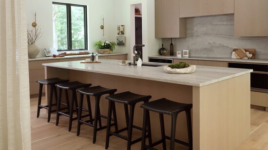 The modern and sleek kitchen includes a huge island with seating for six. “I am also really loving having a back kitchen,” she says. “Having the extra space to prep and clean up and then close a door has helped decrease the stress of entertaining in an open space.”
