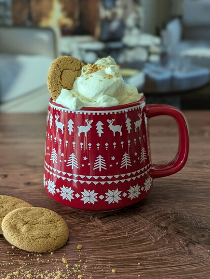 Top with homemade whipped cream and gingerbread cookie crumbs.