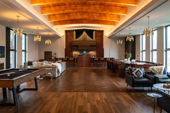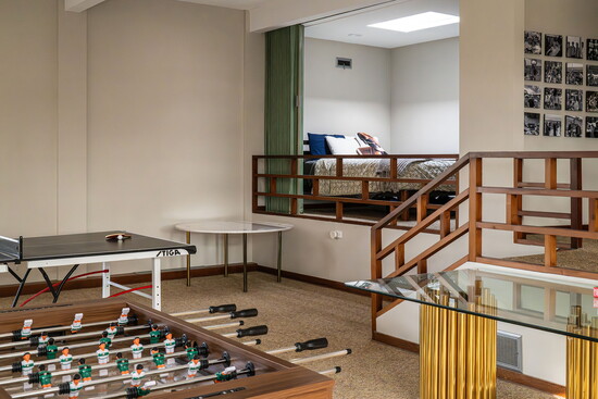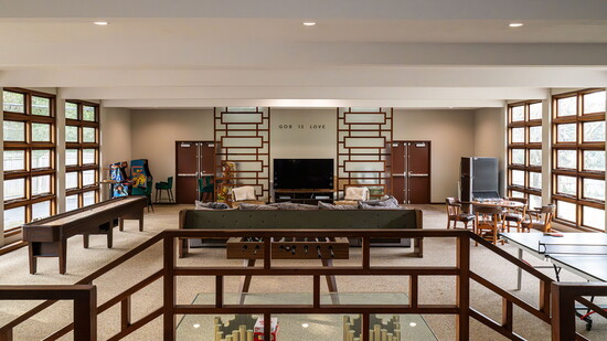 That philosophy continues in the former Sunday school wing, now a recreation room filled with a pool table, foosball, arcade games and a long communal table. Above the television, original lettering still reads, "God is Love," preserved as a focal point and a quiet reminder of the building’s past.