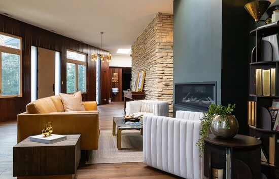 On a quiet stretch of Glenview Road, the fireplace glows where rows of pews once faced forward in unison. Leather chairs and a curved sectional gather close to the stone surround, softening the scale of a room originally designed for congregation rather than conversation. For Pam and Matt MacPherson, this intimate seating area is the heart of a home that still carries the bones, and the memory, of its former life as a Christian Science church.