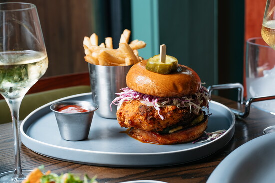 And the food—well, it’s not trying too hard. Familiar dishes are elevated without being fussy. A fork cracks gently into a crème brûlée’s sugar shell while someone across the table laughs with a glass of something golden in hand. A plate of fried cod lands between them, crisp and hot, with a side of dill tartar sauce that tastes like someone actually cared. There’s a richness to the flavors, but also a simplicity—a kind of honesty that makes the meal feel grounded, even elegant.