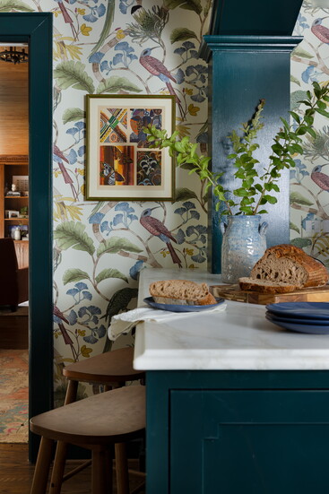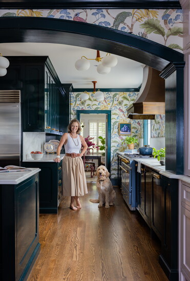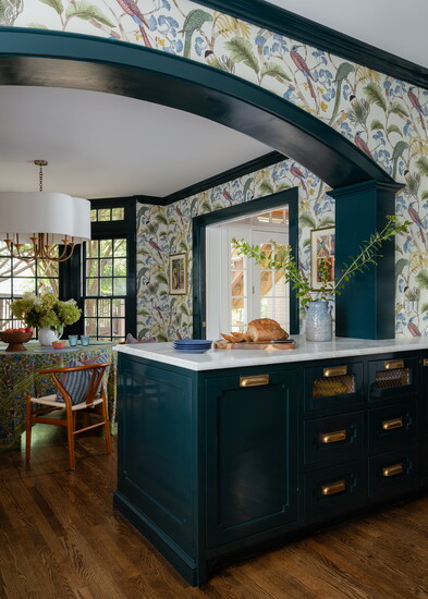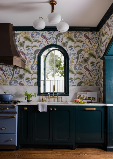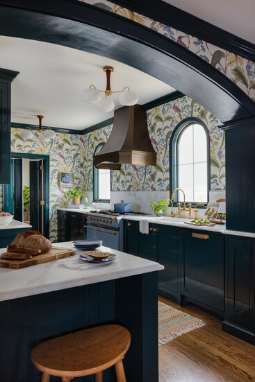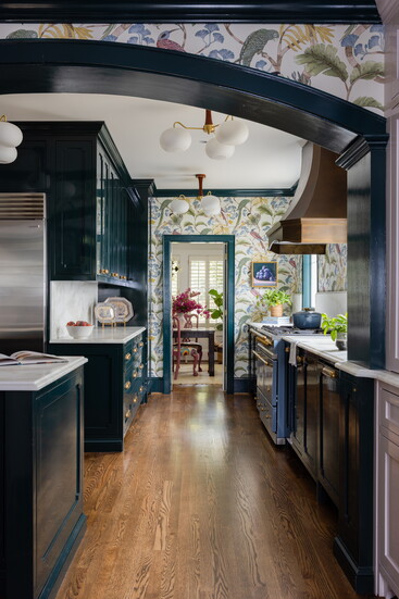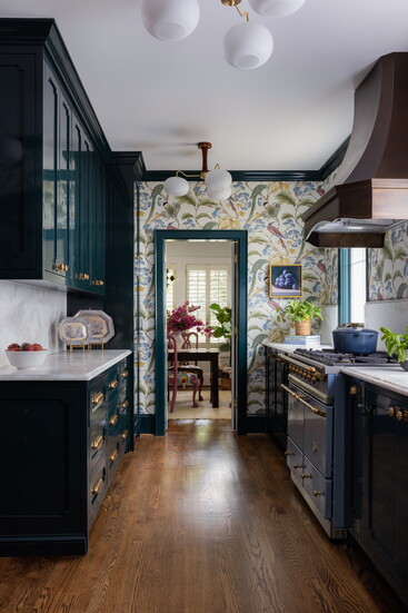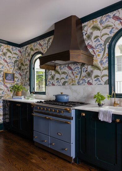 “It ended up being a perfect piece that could stand on its own against the busy wallpaper,” she says. “There are a lot of bold pieces and elements in this space, but I didn’t want any one thing to overpower another. That blue range in a white kitchen would be the one thing you looked at, but adjacent to the darker richness of the cabinetry, it fits really well. It’s a nice balance overall.”