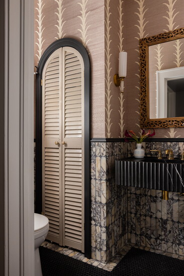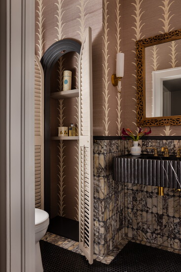 The new kitchen layout gave them a few extra feet to add a linen closet, which Copeland accented with vintage slatted doors she refinished. The floating vanity has a scalloped edge, and the marble wall tiles echo the arches in the kitchen. The sconces are from Arteriors.