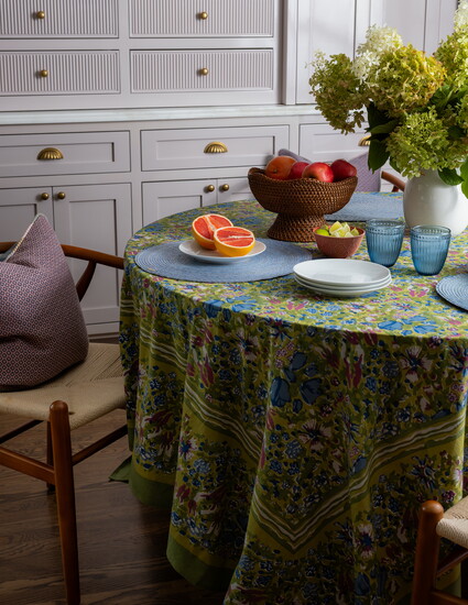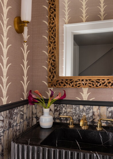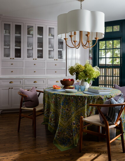 She continued the wallpaper into the breakfast nook, where a drum pendant with a scalloped shade hangs overhead. The built-in cabinets feature a mix of solid and ribbed fronts painted in Sherwin-Williams’ Vaguely Mauve. The hardware has the same unlacquered brass finish as the kitchen.