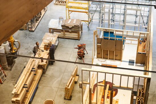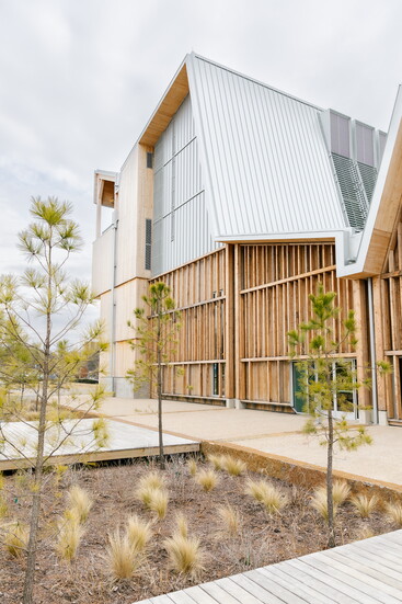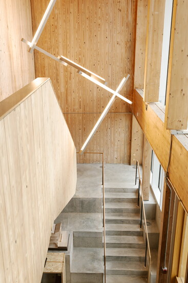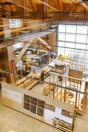 The center was built using approximately 80% mass timber, with wood sourced primarily out of Arkansas forests (with a few European exceptions). The facility offers a space for mass and timber research as well as a home for the university’s new integrated wood design graduate degree program. At the base of the building is a grand-scale fabrication lab that offers architecture and design students a space to take their projects to the next level.