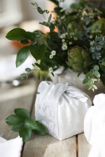 Instructions: fill the vase with floral foam and soak with water. Insert one wooden skewer into the stem of each artichoke. To arrange, first insert skewered artichokes into the floral foam. Then, fill gaps with greens and flowers.