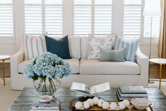 The refreshed design embraces a light and airy feel through a layered approach. A simple palette of blues and whites sets the foundation, while a thoughtful mix of textures and patterns adds depth and warmth. Pattern on pattern was used intentionally to create visual interest and a sense of charm without overwhelming the space.