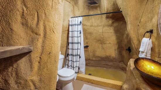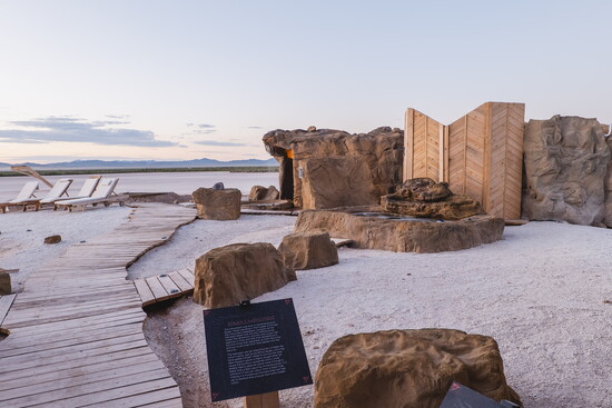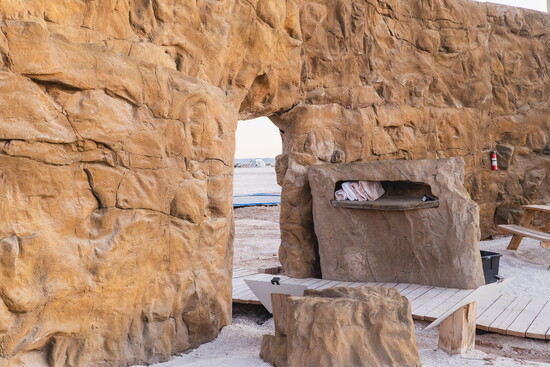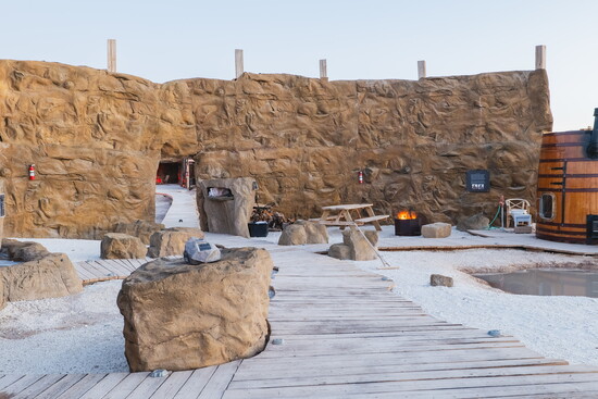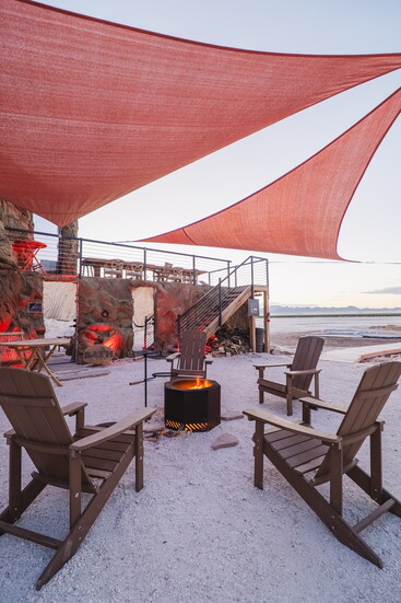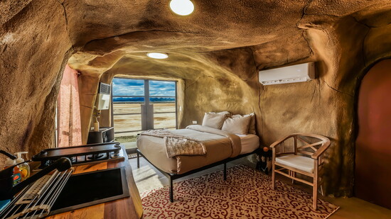 The accommodations themselves feel like outposts from another realm. Guests can choose from several unique unit types, each designed to make the stay feel like part of the adventure. The original Cave Suites offer a cozy, futuristic atmosphere with sculpted interiors that feel both grounded and imaginative. Geodesic Domes invite guests to sleep beneath the stars while still enjoying modern comfort, creating an experience that feels equal parts shelter and observatory. Viking Tents bring a spirit of adventure with their rugged yet welcoming design, while the newest Cave Villa units, located out on the playa, include private loft spaces that elevate the experience even further, giving guests their own quiet corner of the desert to take in sunrise and sunset views.