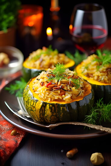 7. Assemble meal: Place squash on a plate, fill with golden rice mixture and top with warm apples and pears. Sprinkle with winter spice and Pink & Pink. Serve warm.