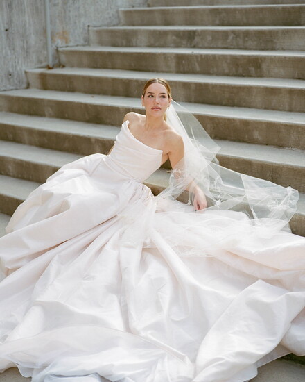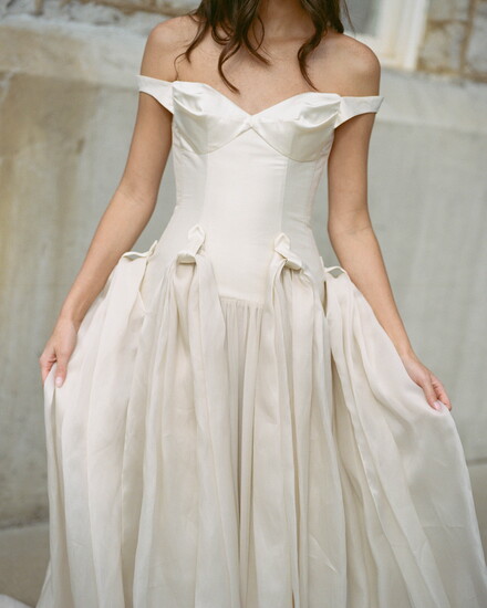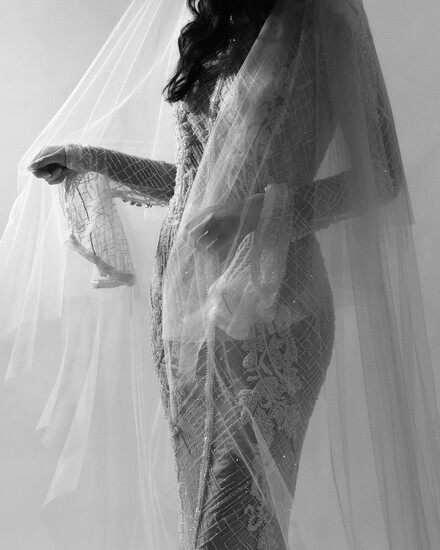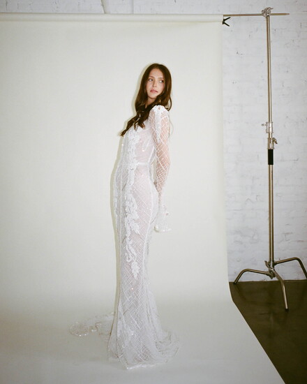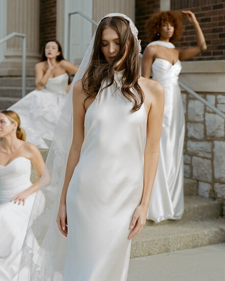 "We always listen to the little details our brides mention they like and try to tie them into the final look. Whether it be a pop of lace through a scarf or sleeve, a custom neckline change, or a fabric swap, this is truly the fun part—when we find a base of the look and make it even more her from there,” the ladies explain.