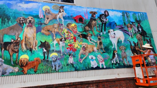 I asked Mary about this project compared to others. She says, “I have painted murals, and I have painted pet portraits, but I have never created something quite like this. During the process, I met so many neighbors and their pets and their unconditional love is what brought the joy. Collectively, those bonds will shine forever through the murals.”