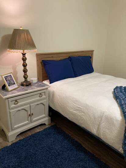 One woman’s answer: Her grandmother’s house. Blue tones. Antique furniture. A sense of calm. HouseN2Home found an oak headboard and an upholstered blue chair with an ottoman, creating a bedroom that echoed that memory—nostalgia turned into a fresh start.