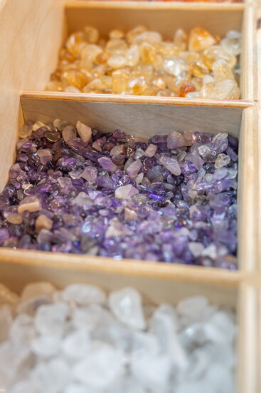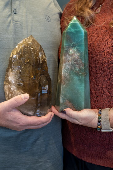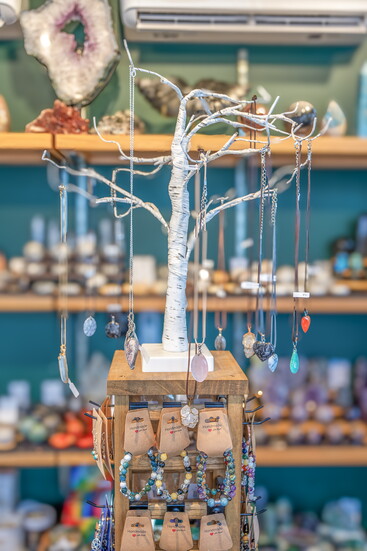 That vision became clearer on Christmas Eve, a family tradition of dinner and a movie. While walking through Mountain View Village, Jaime spotted a small glass pop-up building. “I stopped and said, ‘That would be the perfect crystal shop.’” Six months later, Rising Moon Minerals opened its doors.