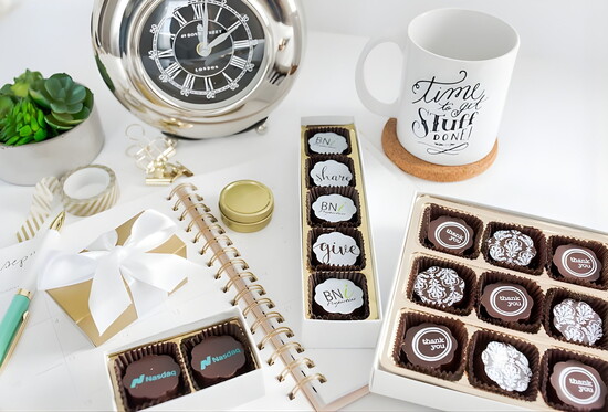 Customers can pay a $125 setup fee, then place custom orders that include a one-color logo and up to five unique designs. “Anything you can put on a T-shirt or a hat I can put on a chocolate,” Dwyer says. “We tell your story on the chocolate.”