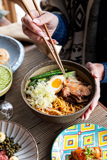 To enhance the overall dining experience, Shokudo's swanky decor is as scrumptious as Hamaya’s culinary presentations. “The interior design was created by David Thompson Studio as an extension of the food's philosophy. That is, rooted in tradition but decidedly modern,” Hamaya said. “One of David’s team members had the opportunity to go to Tokyo, which provided a lot of inspiration for the design you see in Shokudô, including a mural that inspired Nysa Hicks’s work in our Japanese Beer Garden. Her colorful art lends a flavorful aesthetic to the space.”