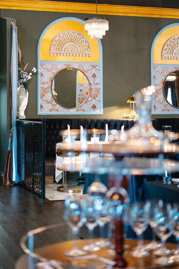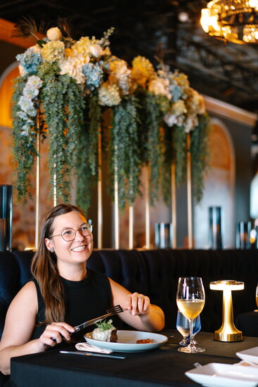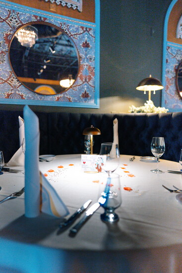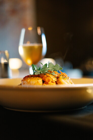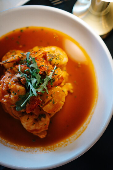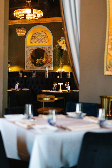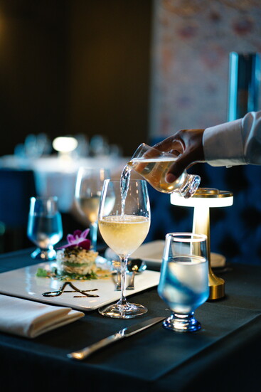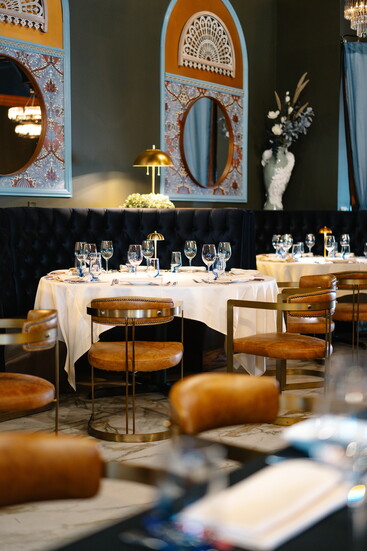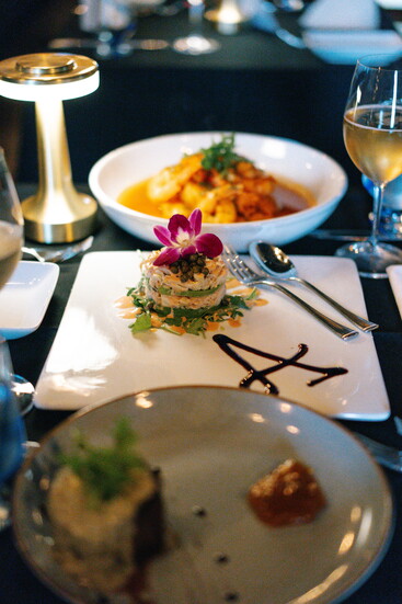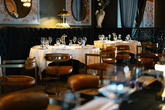 At his namesake restaurant, Andreas focuses on the refinement of French cuisine, weaving those influences throughout both the menu and the space. Art Nouveau touches set the tone, with elegant peacock motifs appearing in stained glass and artwork. The dining room exudes French cosmopolitan style: a long banquette anchors the space, chandeliers sparkle overhead, and candlelight enhances the warm, romantic ambiance.
