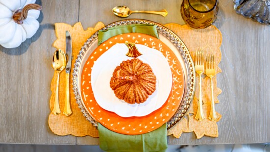 Visual merchandising manager, Sandy Sylvester, of Ivy and Sage created a Thanksgiving table scape to inspire your own this holiday. Using a color scheme of orange, gold, green, white, and black, the effect is traditional and classic. She used pumpkins, leaves, pinecones, tapers and a custom floral piece. The look is layered and warm. Sandy's top tip is 'Go with what you love'.