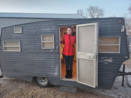In 2023, Cynthia started buying and selling online. After the first auction, she and her husband drove to South Dakota to pick up what she had bought, and it almost didn’t fit into their van. Obviously, Cynthia needed more room. She purchased a small camper that had been used as a hunting blind. “She was ugly,” Cynthia says. “But she had potential.”