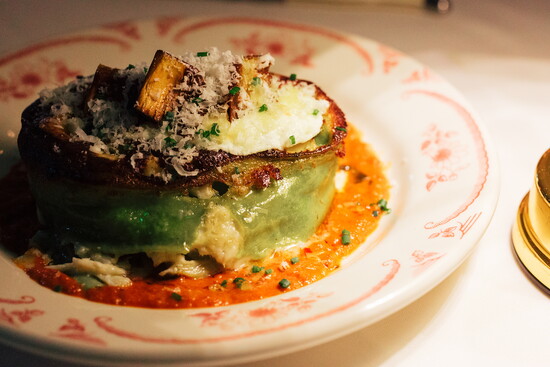 The Caesar salad follows. Cured lemons — salted, sugared, sliced whole — cut through the rich, umami-laced dressing made with Japanese mayonnaise, bringing unexpected brightness to a classic.