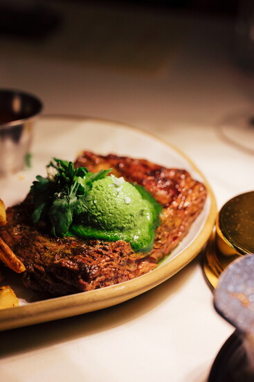 Then comes the 20-ounce ribeye, gleaming under a pat of truffle butter, anchored by sides he swears by: crispy polenta, Brussels sprouts, and pommes frites. It’s the kind of dish that feels both indulgent and just right for a special night.