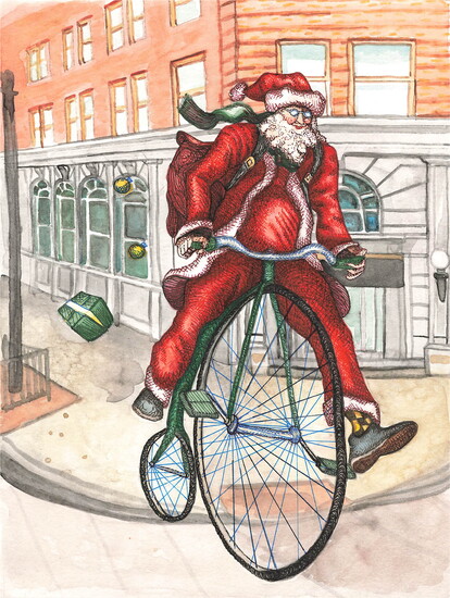 For Frederick Lifestyle’s December cover, Shelby channeled that same spirit—depicting Santa pedaling through downtown Frederick on a penny-farthing bicycle when his sleigh just wouldn’t do.