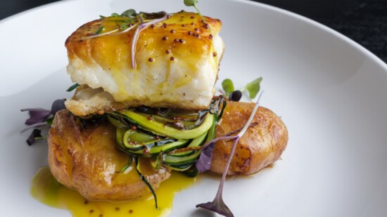 Layer on plate potatoes, zucchini, halibut, sauce.