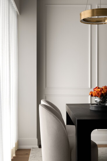 In the dining room — one of Vucaj’s favorites — custom paneling with refined proportions added architectural interest without feeling heavy or too traditional, aided by soft white paint. Floor-to-ceiling drapery in crisp white linens softens the room, while the warm metallic finish of a sculptural brass chandelier adds a whisper of glamour, grounded by the dark wood table.