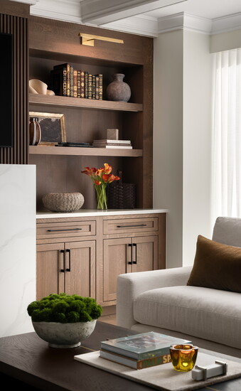 Keeping the palette neutral was key to creating the sense of calm the couple wanted, creating a backdrop of soft, serene surfaces that let the architecture and furnishings — and details like painted custom millwork, paneling and built-ins — shine without feeling busy. In the kitchen and baths, Vucaj used natural stones — marble and quartz.