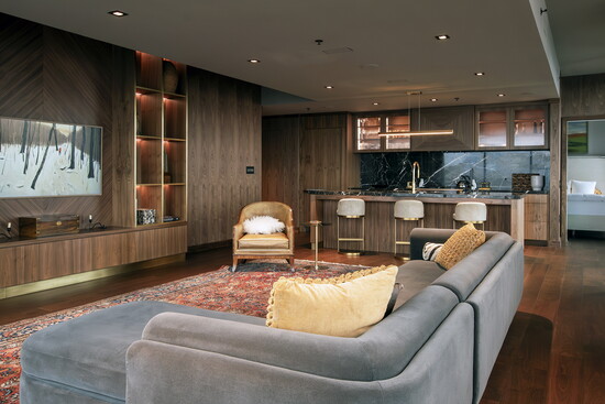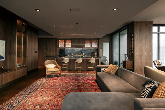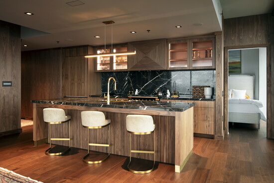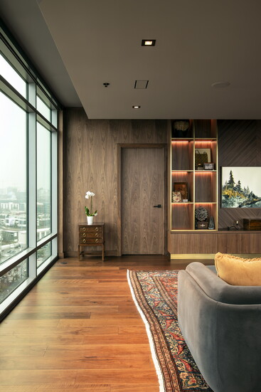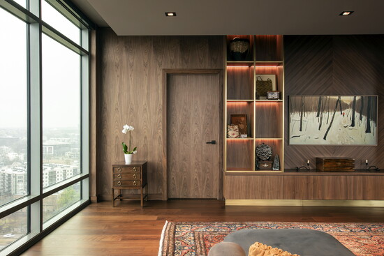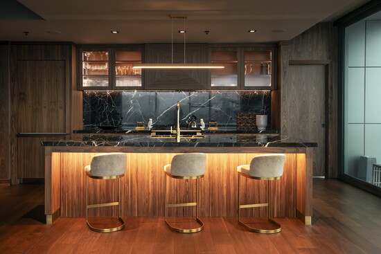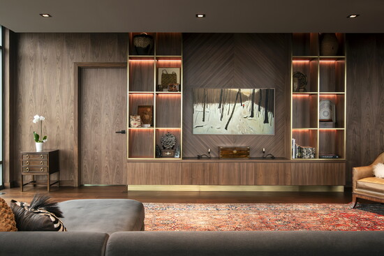 Cabinetry played a pivotal role in achieving the final look. Rather than acting as a backdrop, it becomes an architectural element in its own right. The walnut cabinetry adds rhythm and continuity, while custom details elevate it beyond standard millwork. Every line, proportion, and finish was carefully considered to support the overall design narrative.