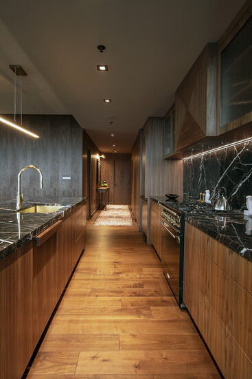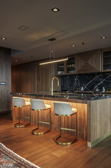 Several bespoke elements make the kitchen truly one of a kind. The custom hood functions as an actual piece of art, anchoring the room visually. A reverse pattern inspired by the hood is echoed in the center of the bookcase, creating a subtle but meaningful design dialogue. Fully walnut-clad walls further distinguish the space, enveloping it in warmth and craftsmanship.