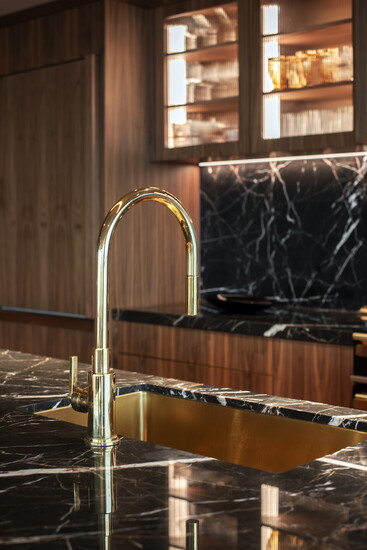 At the heart of the kitchen is the island, undeniably the focal point of the room. What sets it apart is not just its scale, but the level of detail. Subtle lighting beneath the overhang highlights the reeded detailing, creating a soft, ambient glow that draws the eye. A brass-accented toe kick adds another layer of elegance, while the St. Laurent marble countertop and integrated brass sink elevate the island from functional surface to sculptural centerpiece. It’s a moment that feels both intentional and indulgent.