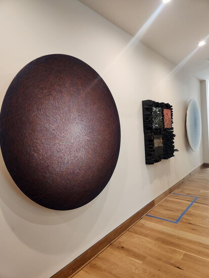 Inside, the lower stairwell and gallery featured commanding works by Didier William, whose layered surfaces and repeated eye motifs reimagine the Black figure with spiritual symbolism and contemporary urgency. The wine lounge and cellar paired Emil Lukas’ luminous string and bubble-wrap compositions with Tom Baril’s refined photographic studies, creating a space defined by quiet rhythm and restraint.