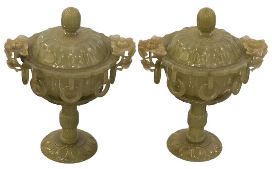 A word about jade. Jade is a two-pronged term used for decorative rocks used for jewelry and other objects de vertu. Jade can be one of two different materials. Either nephrite or jadeite. Your covered jars are the latter. Jadeite is the more precious type of jade. Most gem-quality jadeite type jade comes from northern Myanmar.