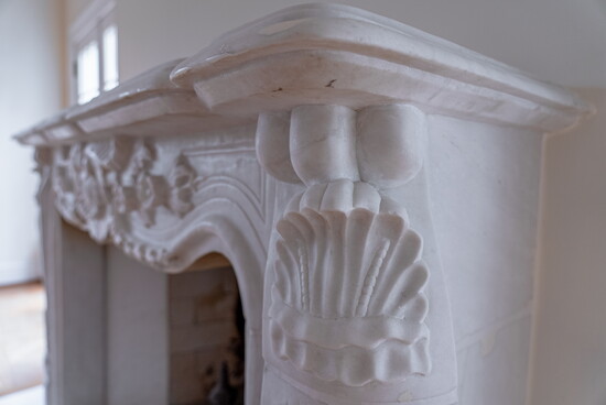 The centerpiece of the living room is a whimsical, hand-carved mantelpiece.