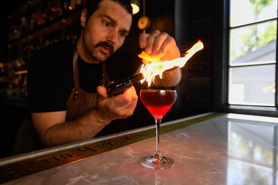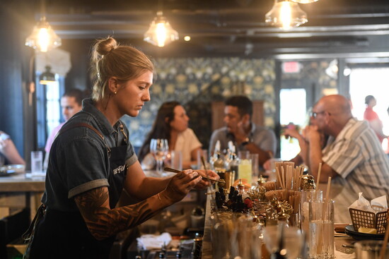 The Franklin seats about 100 guests. The main dining room is anchored by two vibrant bars — one mixing craft cocktails, the other serving oysters on ice. Upstairs, a cozy dining room doubles as event space, perfect for birthdays, anniversaries or small celebrations. There’s also a space called “The Nook” that offers a tucked-in retreat.