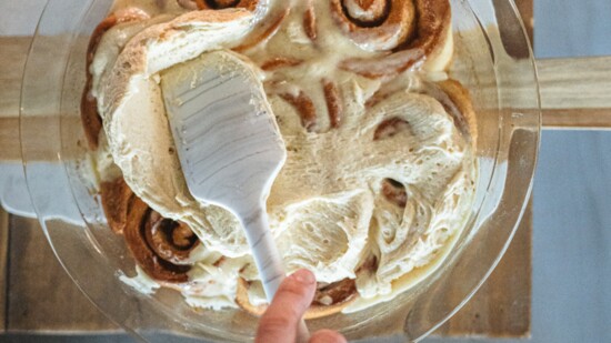 Once cinnamon rolls are done, remove pan from oven and place on a wire rack. Let sit for five minutes, and then frost rolls while still warm.