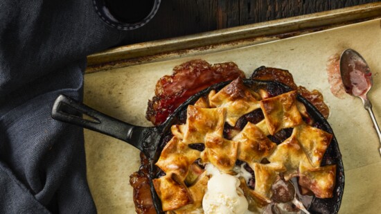 8. Remove from the oven and let cool on a rack for 15 minutes. Scoop the pandowdy into serving bowls and serve with a generous scoop of vanilla ice cream.