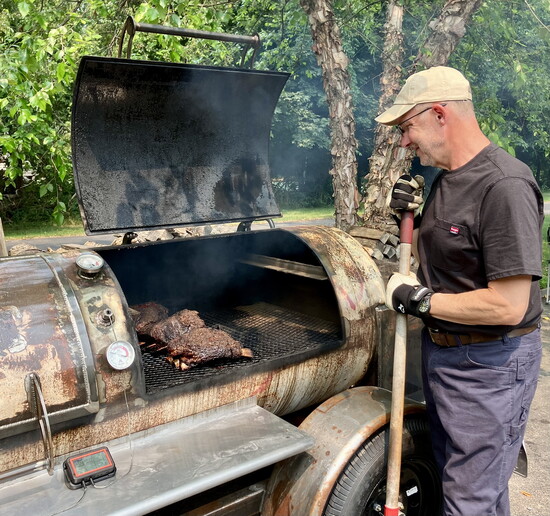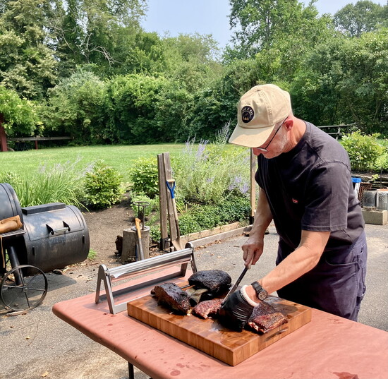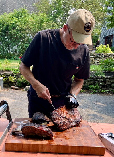 Sitting in Wyatt and Janet’s backyard, enjoying the blue sky and warm temps with the hint of salt and low tide coming off the harbor, we’re all in good spirits. Plates balanced on our laps, we discuss how music adds to the barbecue experience, and I’m curious what kind of music Wyatt chooses to accompany his work. “Lyle Lovett and his Big Band,” Wyatt says, smiling.