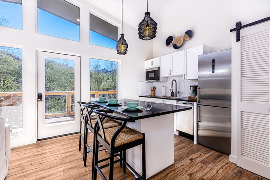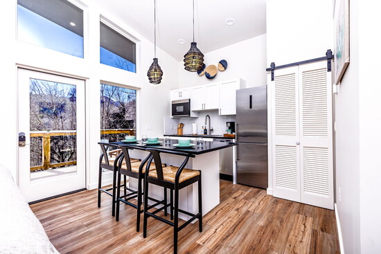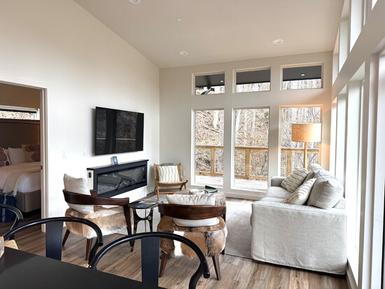 The NOC’s new bungalow-style cabins, The Hemlocks, are modern one and two-bedroom homes with wrap-around decks and expansive views from a vaulted great room with an electric fireplace, huge TV and kitchenette. The River’s End Restaurant just down the hill is open year-round, serving comfort food, a really beefy, thick chili and great service.