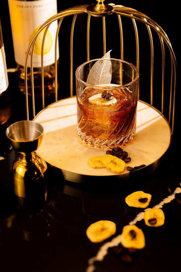 Pour all the ingredients into a mixing glass filled with ice. Stir for 30 seconds with a bar spoon. Strain over a large ice cube in a rocks glass. Garnish with a dehydrated banana chip and espresso beans.
