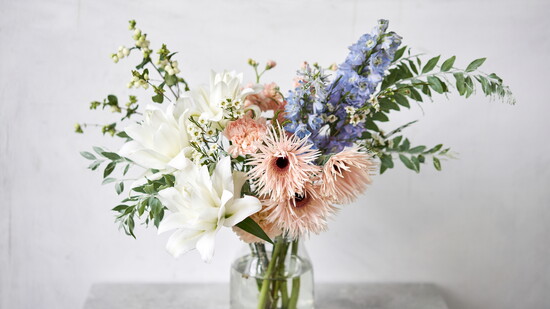 A cheerful nod to the Garden State, Jersey in Bloom features blue, yellow and purple wildflowers arranged in a sleek white glass cylinder vase. It captures the feeling of spring in New Jersey—bright, breezy and full of color.
