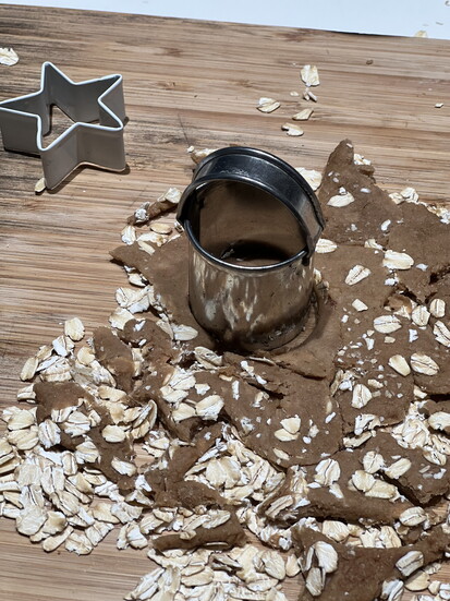 - Transfer dough to a floured surface. Use extra ground oats, whole wheat flour, or another dog-safe flour to keep it from sticking. Roll the dough and cut into shapes with a cookie cutter—or slice into squares with a knife or pizza cutter.
