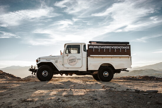 Our truck (which Johnson lovingly calls “she”) is part of the sparkle, and we bring it! People book her because they have some memories or connection with a similar truck or love that she is one of a kind. Bubbles and Brews is part of a franchise, and most of the other locations use Italian Piaggio Apes, (a three-wheeled commercial vehicle) but I received special permission to refurbish the truck because she perfectly fits the rugged, cute, and sexy vibe of Reno Tahoe.