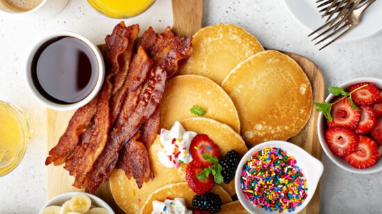The night before, they gather the ingredients for their creation: fluffy banana pancakes paired with crispy bacon and a dollop of homemade whipped cream.