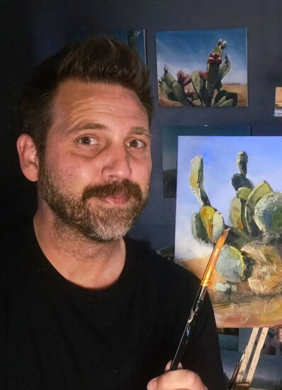 The pandemic allowed him the opportunity to start investigating art and start growing in his artistic skills. His wife, encouraging the investigation, got him an oil painting kit for Christmas. Matthew calls it kismet, the way that everything came together for him to start painting. When he first moved to Arizona, he was still playing and working with recording with his bandmates through internet applications that allowed collaboration. Once he had the oil painting kit and started painting, he knew right away he wanted to focus on painting.