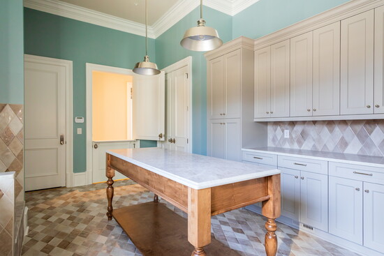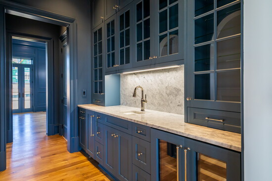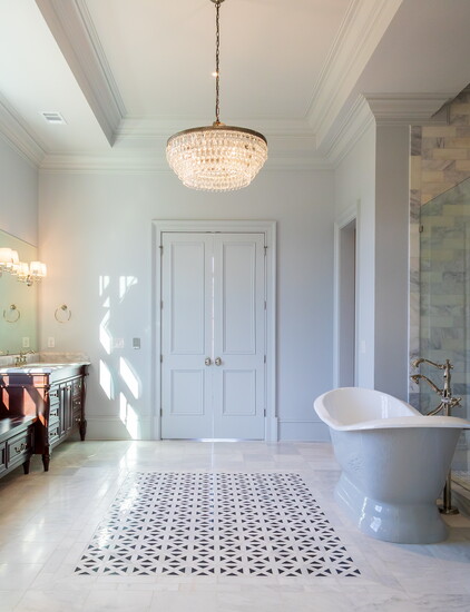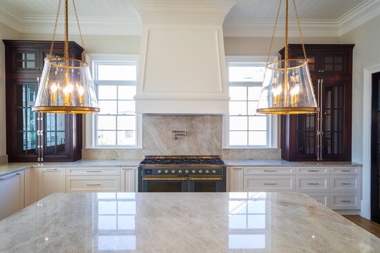 One of Beth’s favorite recent projects is Caroline, located in River Island. The home reflects many of her favorite design elements and functional features. “Every detail was thoughtfully designed, and I had so much fun bringing it all together,” she says. The seven thousand square foot home includes a pool and offers a wide range of spaces for entertaining and everyday living. Highlights include a sixty-inch Ilve gas range with gold hardware, a kitchen island designed to resemble a piece of furniture, and a highly functional laundry room featuring a dog wash, feeding station, sink, and large storage island. The primary suite includes spacious his and her closets, while additional features include a bunk room, finished basement, home theater, gym, and an attached pool house that is heated and cooled for year-round use.